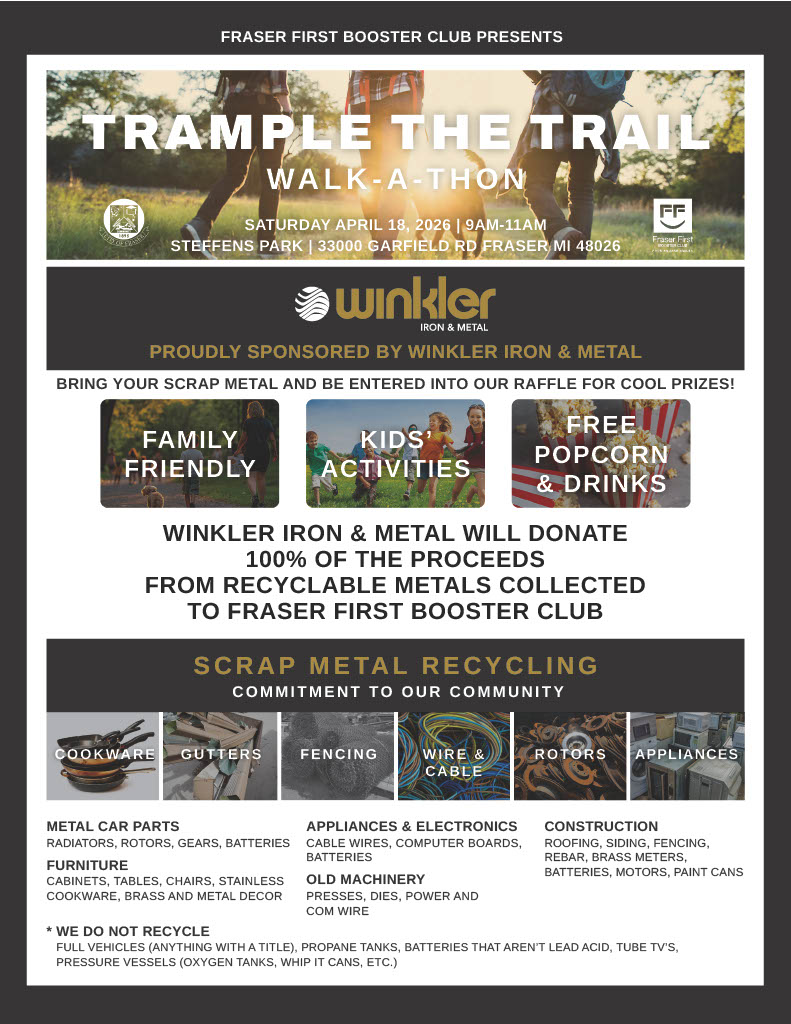 Walk-a-thon & recycle event – Meet new people, enjoy the outdoors, support Fraser First Booster Club’s Reimagine Steffens Park Projects, and recycle with Fraser’s own Winkler Iron & Metal.